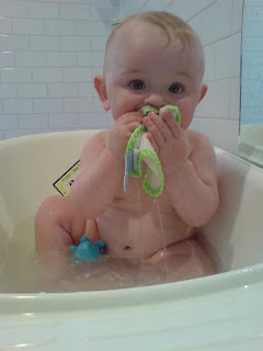 Simple, eh. [Again- I have so many brains, so few clues.] And, yes, as I folded up the last bath towel, he started to get cranky. So I picked him up and put him in the basket on top of the washing and carried him inside- he thought that was hilarious. I gave him some of his red lentil mush and he loved it. And then he had had enough and got a bit cranky. So I took him out of the high chair and tickled him. He snorted and snuffled and giggled 'til he was fit to burst.
